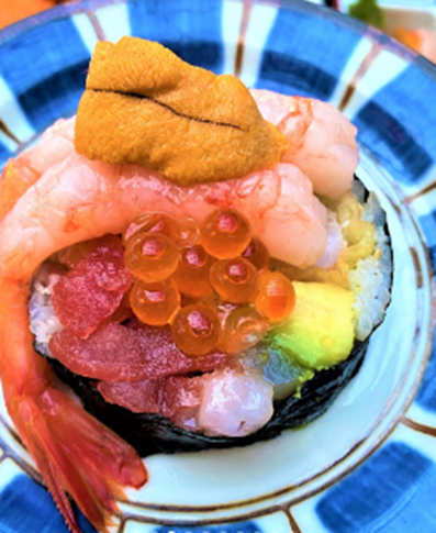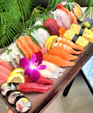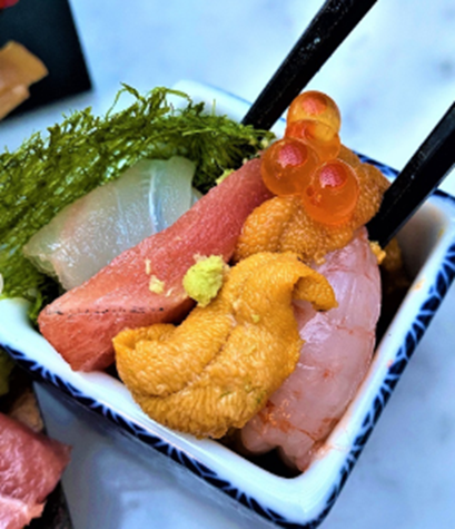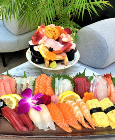 마키 위 사시미와 해산물을 산처럼 쌓아올린